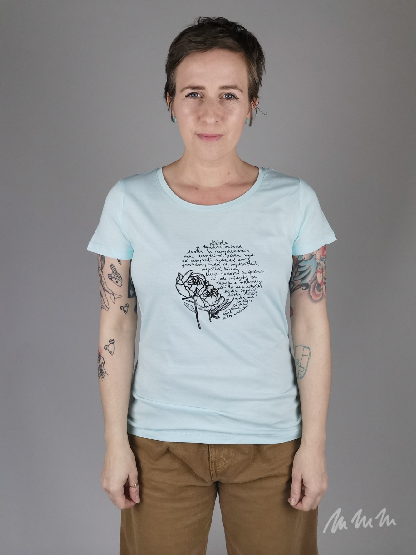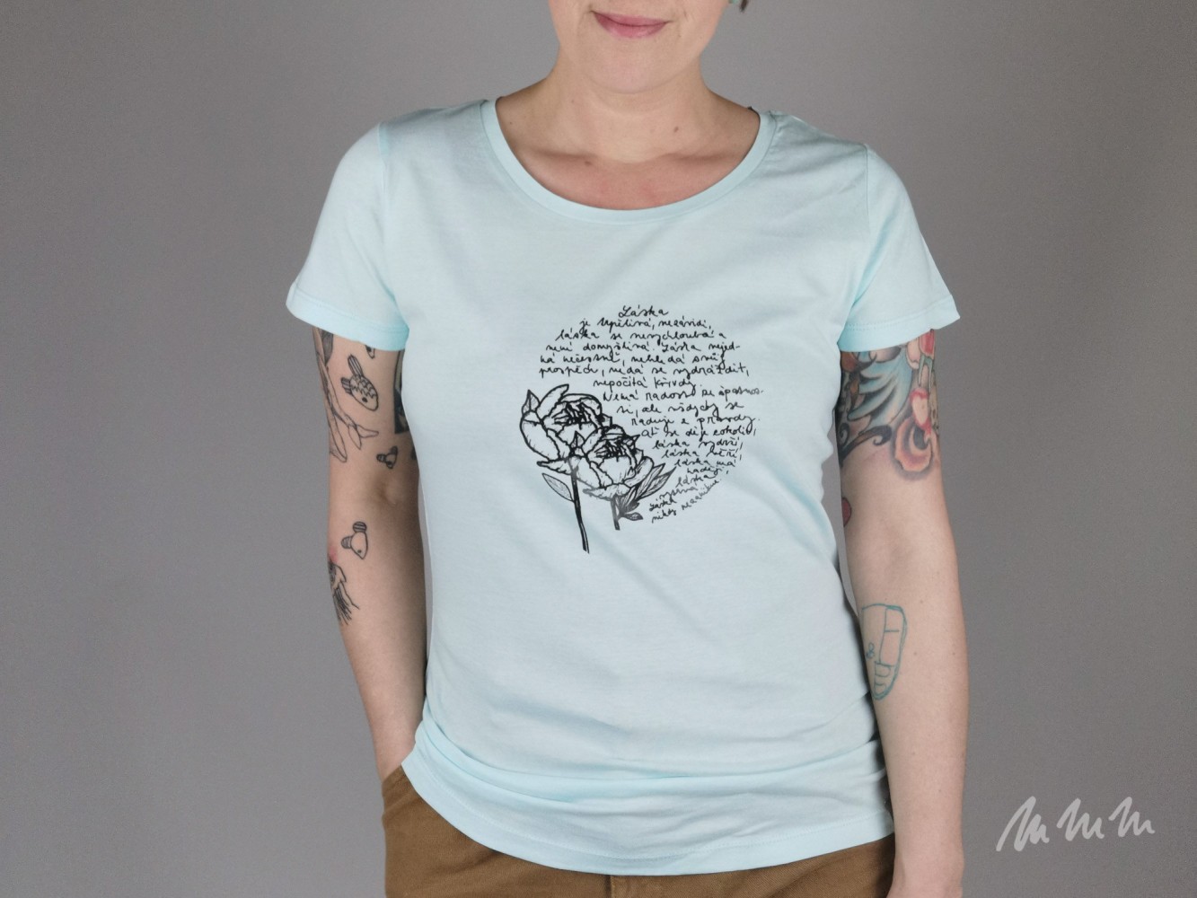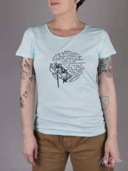 Biobavlněné tričko s autorským motivem natisknuté ručním sítotiskem. Barvu potisku lze změnit. Napište nám do poznámky k nákupu.