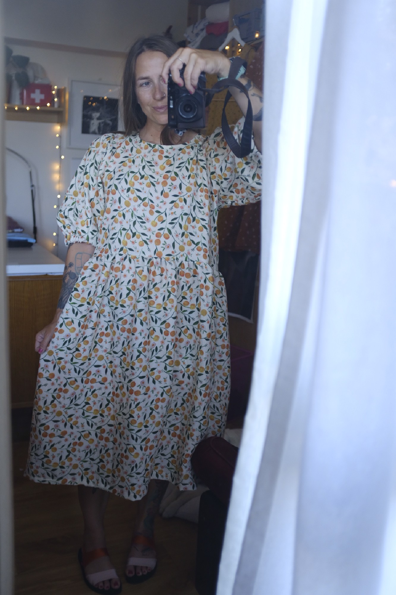 Šaty mají kapsy. Mají šňůrku na úvaz v pase.