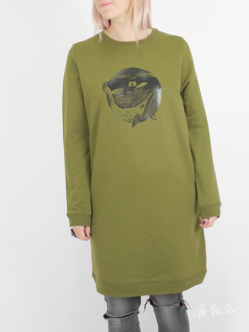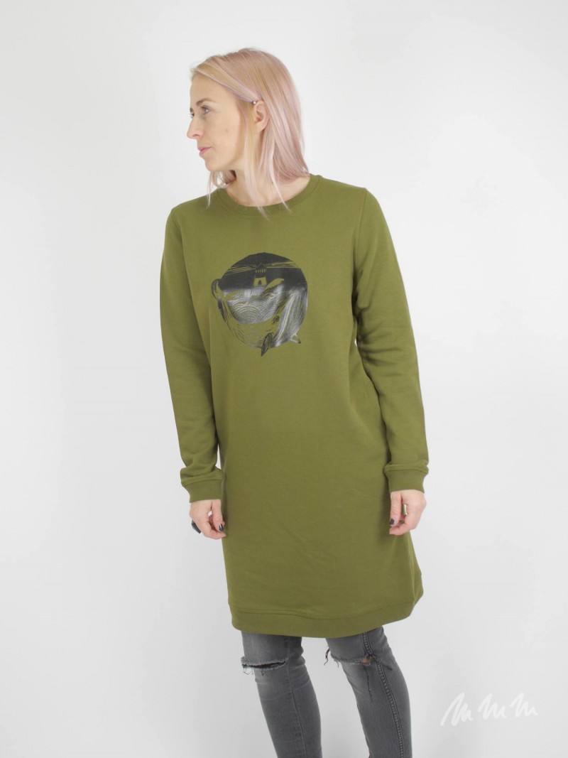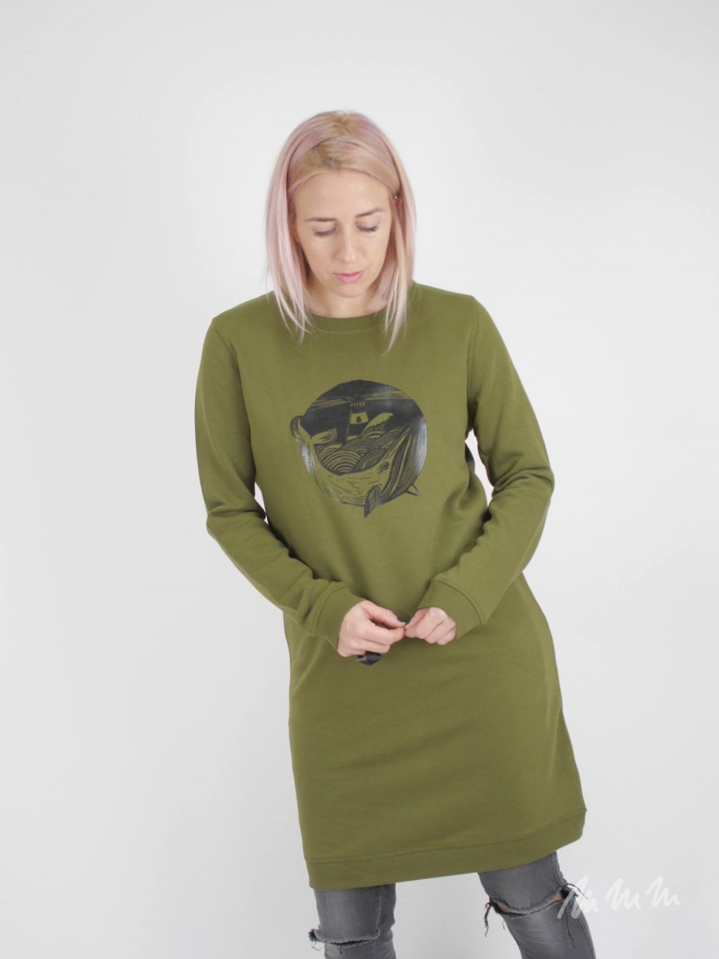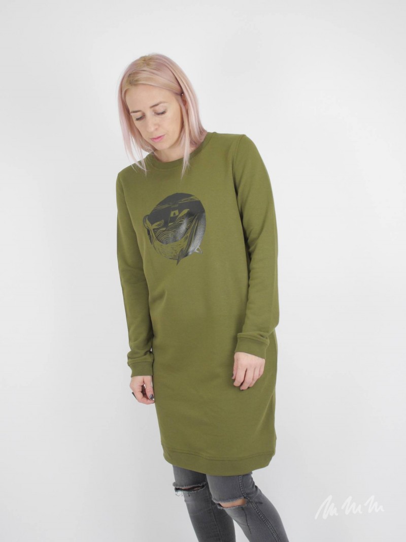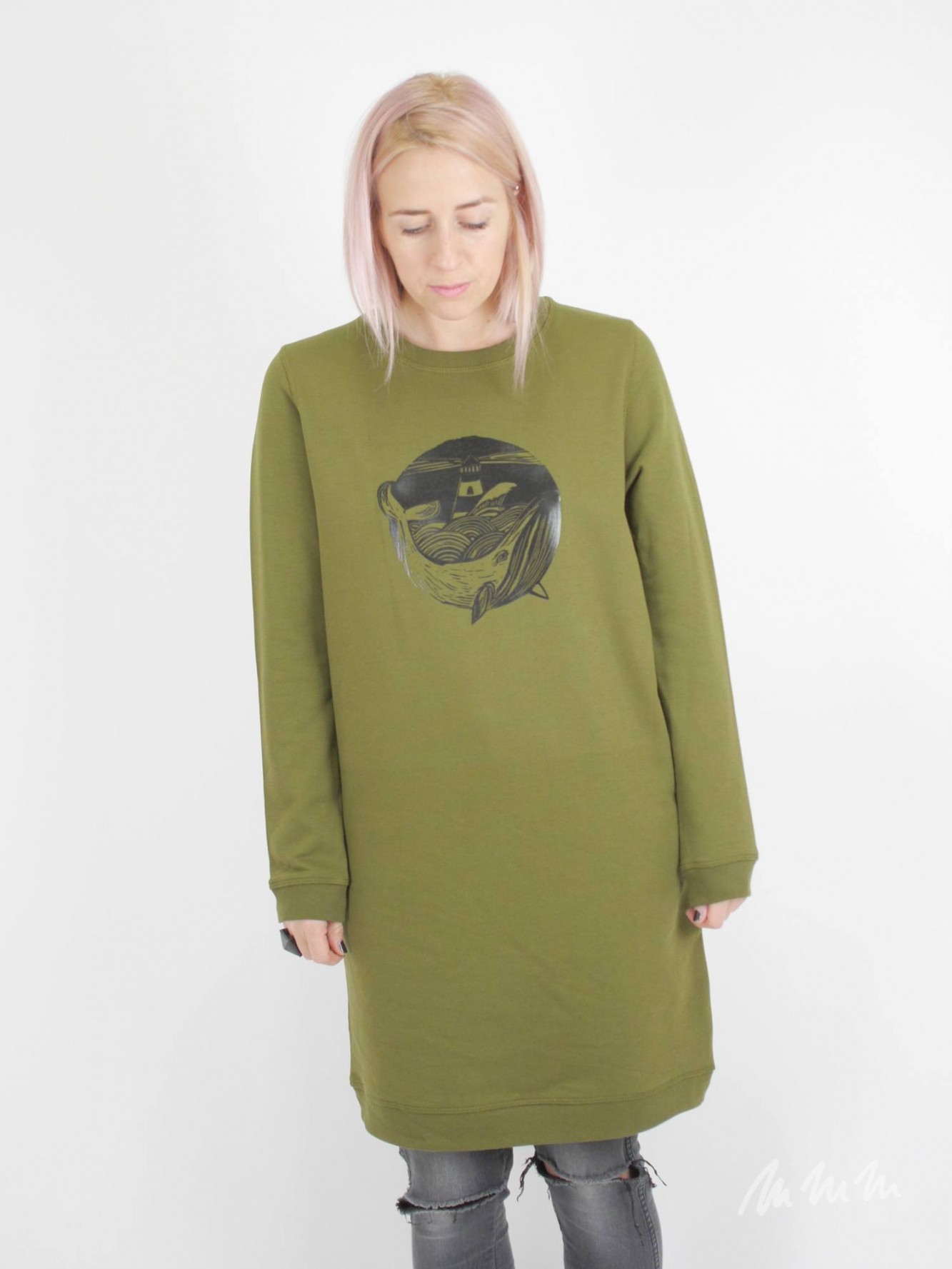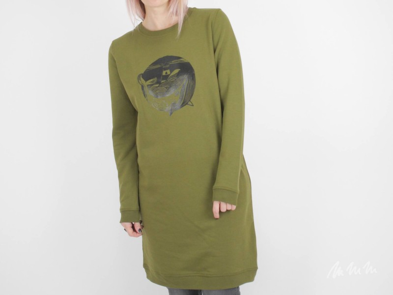 Biobavlněné mikinošaty s rovným střihem a autorským motivem natisknuté ručním sítotiskem. Barvu potisku lze změnit. Napište nám do poznámky k nákupu.