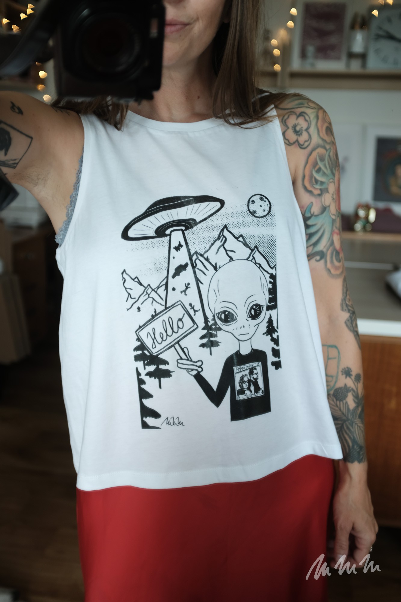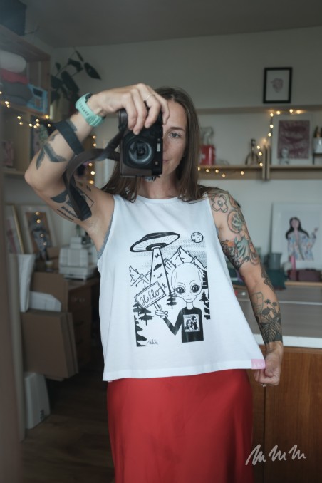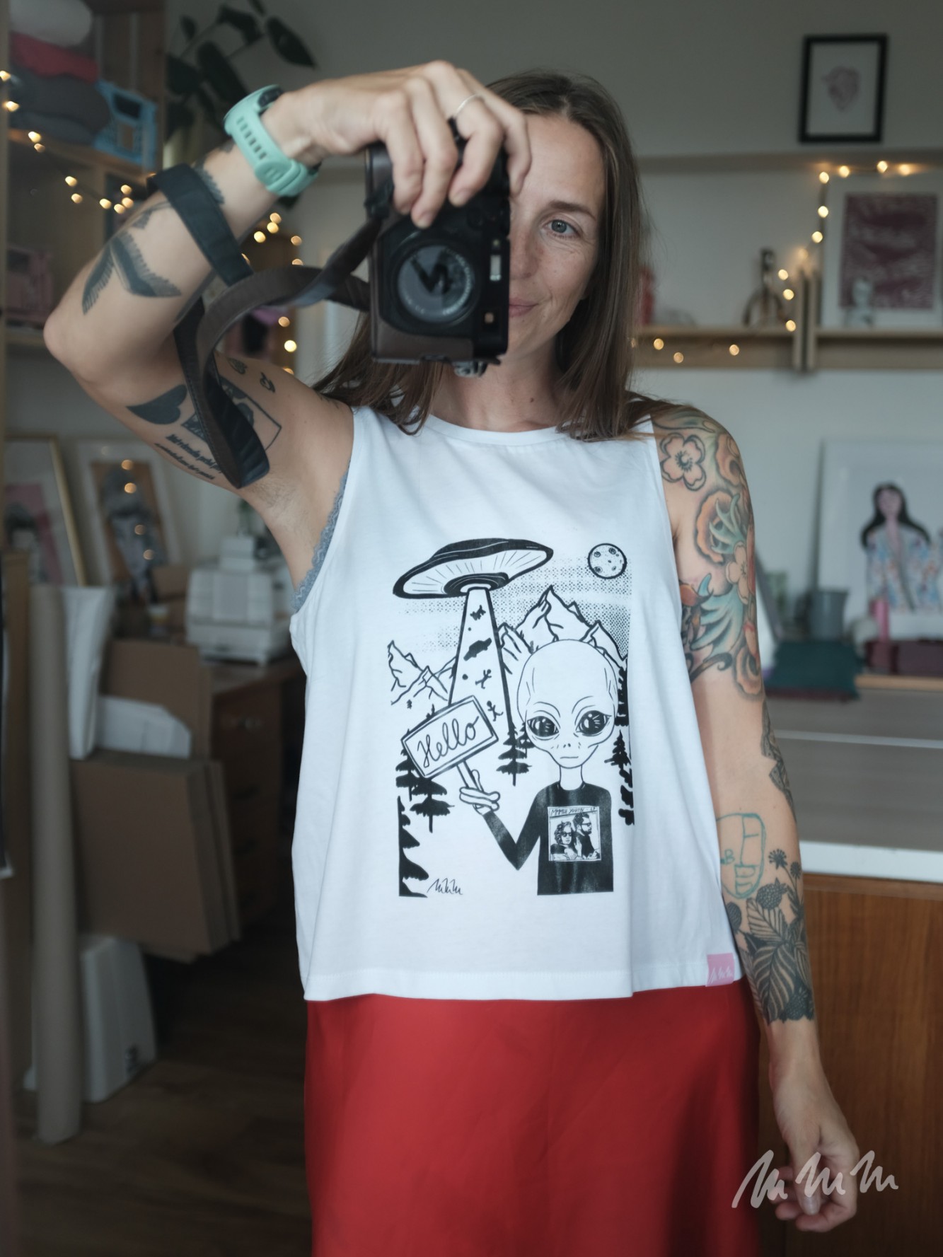 Biobavlněné tílko s autorským motivem natisknuté ručním sítotiskem. Barvu potisku i motiv lze změnit. Napište nám do poznámky k nákupu.