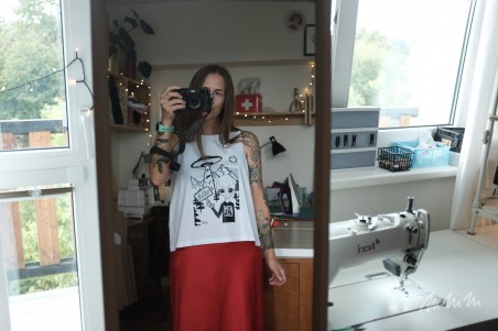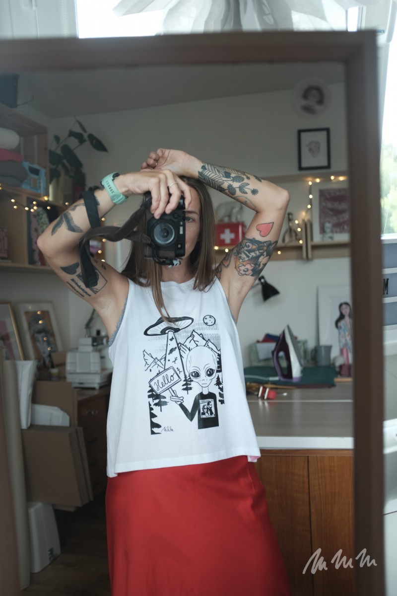 Autorská ilustrace natisknuta sítotiskem. Sítotisk je mezi tisky ten nejdéle udržitelný. Tiskneme na biobavlněná tílka, která mají dohledatelný původ. Lidé, kteří je pro nás vyrobili pracovali v lidských podmínkách za přijatelný plat.
